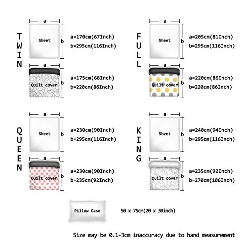 - Queen size – flat sheet 90 x 116 inch, Duvet cover 90 x 92 in, 2 pillow cases 20 x 30 inch