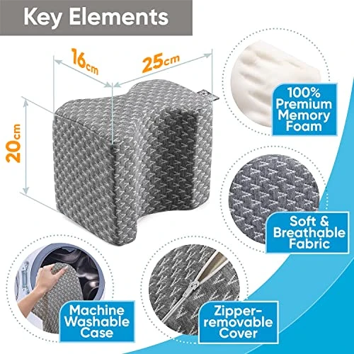 - Knee Pillow: This divider allows you to sleep comfortably all night, separates the upper knee from the lower one and creates the correct spacing between them. The therapeutic effect of the orthopedic pillow allows you to properly align your spine and reduce the pressure during sleep, which guarantees you a vigorous and painless awakening. Good alternative to back pillow for lower back pain