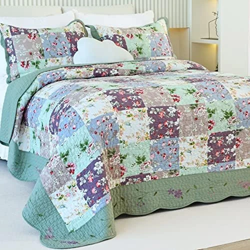 - γPATTERN&STYLEγ: The bedspread set of 3 size has vermicelli quilting and special design with scalloped bound ends. The prewashed cotton quilt filled with natural cotton to guarantee the softness and improvement of your bedding taste. Crafted real stitching with embroidery pattern introduce the garden indoor refreshing and updating your bedroom with this beautiful floral bouquet.