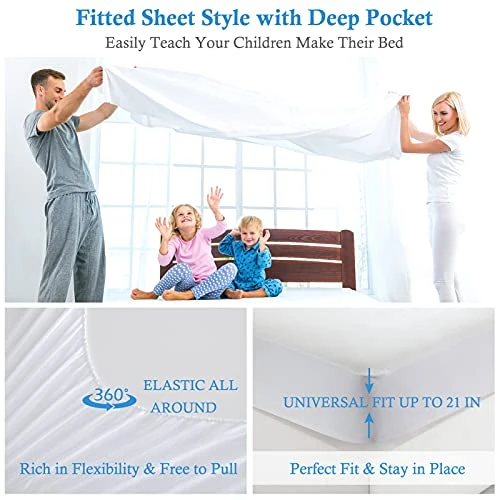- π€[FITTED SHEET STYLE, UNIVERSAL FIT]: The waterproof mattress protector looks much like a fitted sheet, can effortlessly be removed and changed(easily make the bed with your kids). The stretchy knit sides and strong elastic strap finishes create deep pockets for a smooth, snug fit on mattresses with a depth of 8-21 inches, perfect fit for all types or thicknesses of mattresses USA sold today including memory foam, latex and innerspring, etc.