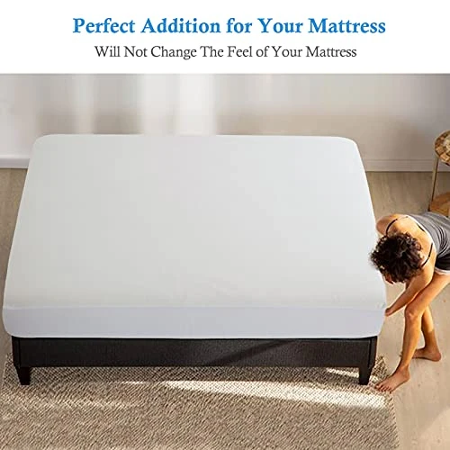 - π€[100% WATERPROOF & LIGHTWEIGHT & NOISELESS]: The back of this mattress protector coated with 100% waterproof TPU membrane, designed to be a visible waterproof barrier to protect your fancy mattress. Water-proofing strong enough to pass the 8 hours and 8-oz-liquid spill test. They effectively repel all liquids, including accidental spills, bodily fluids like sweat or urine. It’s ultra-thin and noiseless, will not make any noises or change the feel of your mattress.