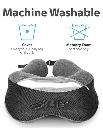 - [MACHINE WASHABLE COVER] No need to risk ruining the support of the memory foam travel pillow or damaging its foam interior. The pillow comes with an easily removable cotton and nylon mesh liner that can be separated and thrown directly into the wash. Just follow the simple instructions included on the packaging and keep your pillow clean and ready to go for the next time you need it.