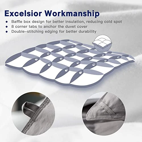 - BAFFLE BOX DESIGN: Keeps the filling at maximum loft for maximum warmth. Ensure the filling stays in place. Elegant piping and 4 corner tabs to easily attach duvet covers.