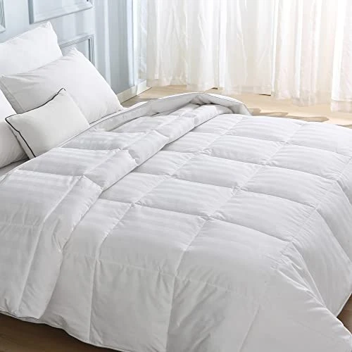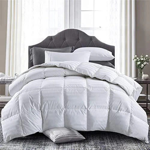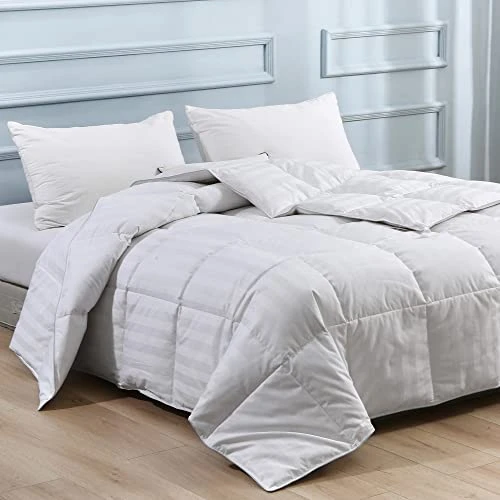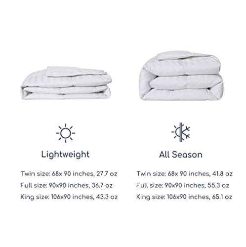 - Lightweight Goose Down Comforter: Twin size down comforter is 68×90 inches and 27.7oz fill weight;Queen size down comforter is 90×90 inches and 36.7oz fill weight;King size feather comforter is 106×90 inches and 43.3oz fill weight. Our lightweight feather down comforter is perfect for warm weather (such as summer, spring, early autumn).