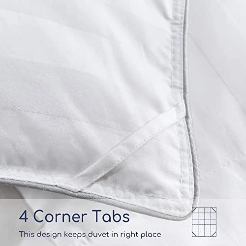 - Professional Design and Versatility: The classic sewn-through construction design prevents the filling from shifting or leaking out. With 4 corner tabs, you can easily add a duvet cover to keep the comforter in place. Our goose down comforter has multiple uses. The white comforter can be used as a duvet insert, a blanket, or a stand-alone comforter.