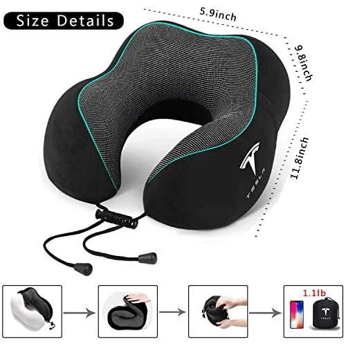 - 🚇【Lightweight and Portable】: KIKIMO memory foam travel pillow was designed for portability and comfort. Only 0.7 lbs. Neck pillows for sleeping features a unique phone pocket for easy access to your essentials when your space is limited. TESLA Model S travel pillows kit with storage bag, sleep mask and earplugs. Perfect travel airplane & Car partner.