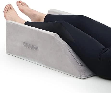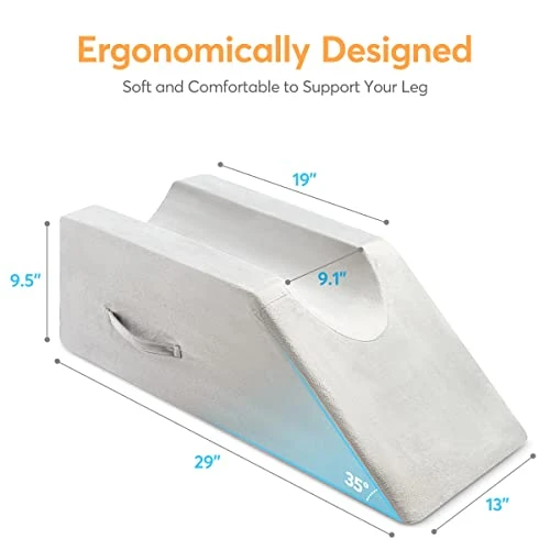 - OPTIMAL INCLINE AND WIDTH – Properly positioning the knee, leg and ankle, the knee elevation pillow provides 35 degrees of incline, Provides perfect support and protection. The knee support wedge relieves swelling and fatigue to promote healing following ACL surgery, knee or hip replacement, as well as sprains, varicose veins, posterior tibial tendon dysfunction and more. And this pillow designed with a contoured channel that easily to place your accommodates bandages and casts leg.