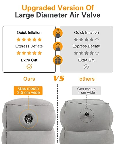 - Very User-Friendly Design: Our inflatable foot rest pillow with 2-in-1 double valve,the upper black air valve is a one-way air inlet for inflating or replenishing gas.bottom transparent air valve can be quickly inflated and deflated,when you are done blowing it up, push clear cover on and push whole valve in so that it is flush with the side of the travel foot pillow,the airplane footrest takes away the hassle of bringing a pump and making noise in flight.