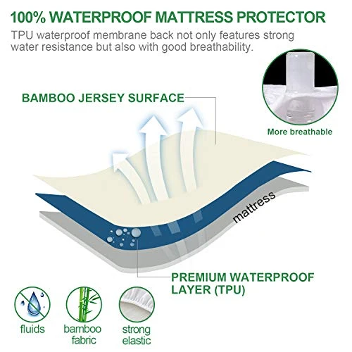 - Waterproof and Noiseless: Waterproof twin mattress protector made of natural cooling bamboo jersey fabric with 100% waterproof Layer on the back to protect your precious mattress keep away from all kinds of liquids including fluids, perspiration, bedwetting and stains. Because of the noiseless TPU layer, you will not hear any noise when you sleep on it.